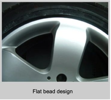 The most common of all wheels are painted and they come in a wide variety of designs. Both photos show wide spoke designs but the important difference here is the design of the bead flanges. The wheel on the left has a flat bead design, which requires stick-on type balancing weights. The wheel on the right has a raised bead design, which is called the wheel weight flange for obvious reasons. Although pound-on type balancing weights can be used on this style wheel, the weights can actually damage the painted finish.