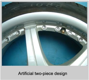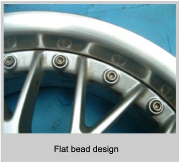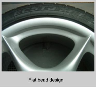 Here are two more styles of painted wheels with flat bead designs. Although some pained wheels resemble polished wheels, most painted wheels will reveal a metallic sparkle when viewed in bright sunlight. The wheel on the right is an artificial two-piece design. This replica design is common with aftermarket wheels but this construction is actually only one piece. The bolts that appear to be holding the wheel together are imitation. In some designs, the faux bolts are not even metal but are actually painted or chrome plated plastic.