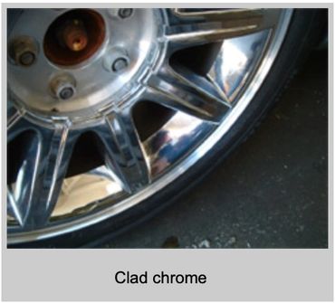 The surface of chrome wheels is the most durable of all finishes. Although the chrome finish is thin, it is very strong and resistant to damage. However, in the colder climates, chrome has a tendency to peel from salted roads along with the freezing and thawing of water. Most chrome wheels finishes resemble those of a kitchen faucet, most of which are also chrome. Some chrome wheels are actually cladding construction. The wheel on the left is a true chrome wheel with a raised bead. On the right a chrome-clad wheel is shown. The face of the wheel is chrome but it is actually a vacuum formed piece of chrome-plated plastic, which is glued onto the aluminum wheel. The raised bead is not clad and the actual aluminum surface is exposed. Although most cladding is now plastic, some designs are made of steel.